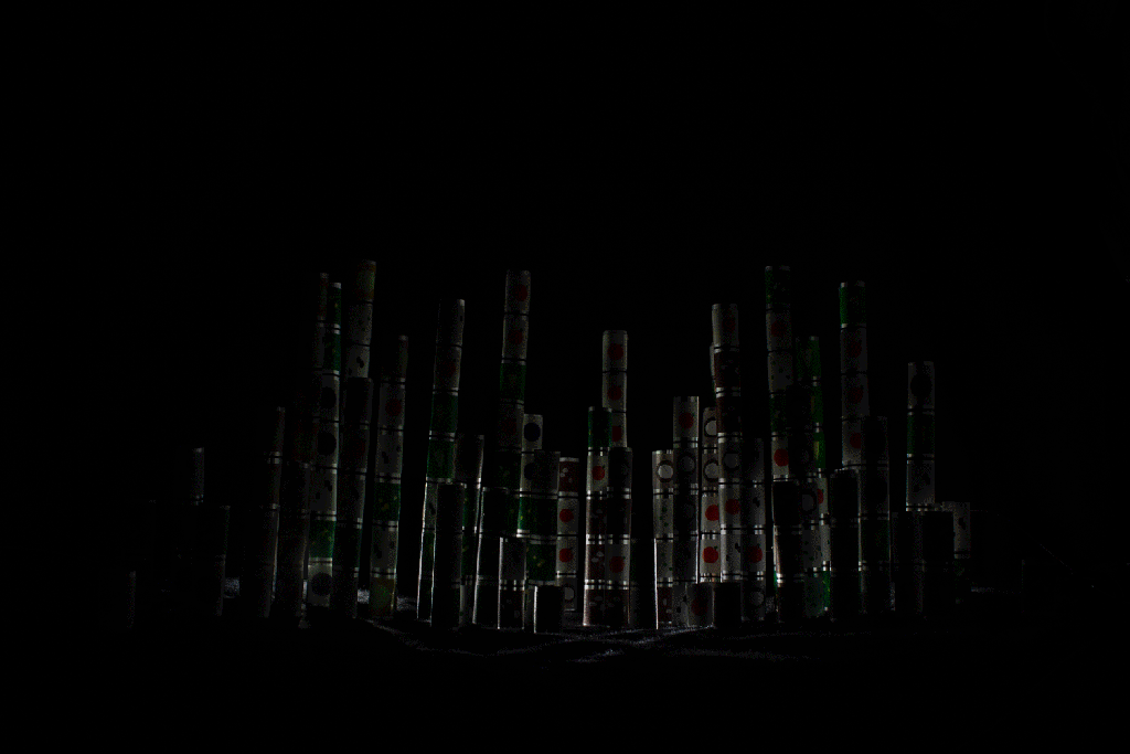 Der Raum wir begrenzt durch seinen Inhalt: Gestapelte Konservendosen geben ihm seinen Rahmen. Hinter den Türmen ist es dunkel; herrscht Leere. Der Raum wirkt jedoch nicht unendlich weit, sondern scheint immer so groß zu sein, wie er durch seine Wände (Dosen) geformt wird.